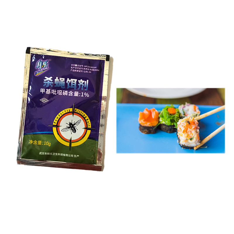 Продукт содержит мухопривлекающее средство для притяжения мух к еде. Мухи умирают от желудочного яда как от еды, так и от контакта с ядом.